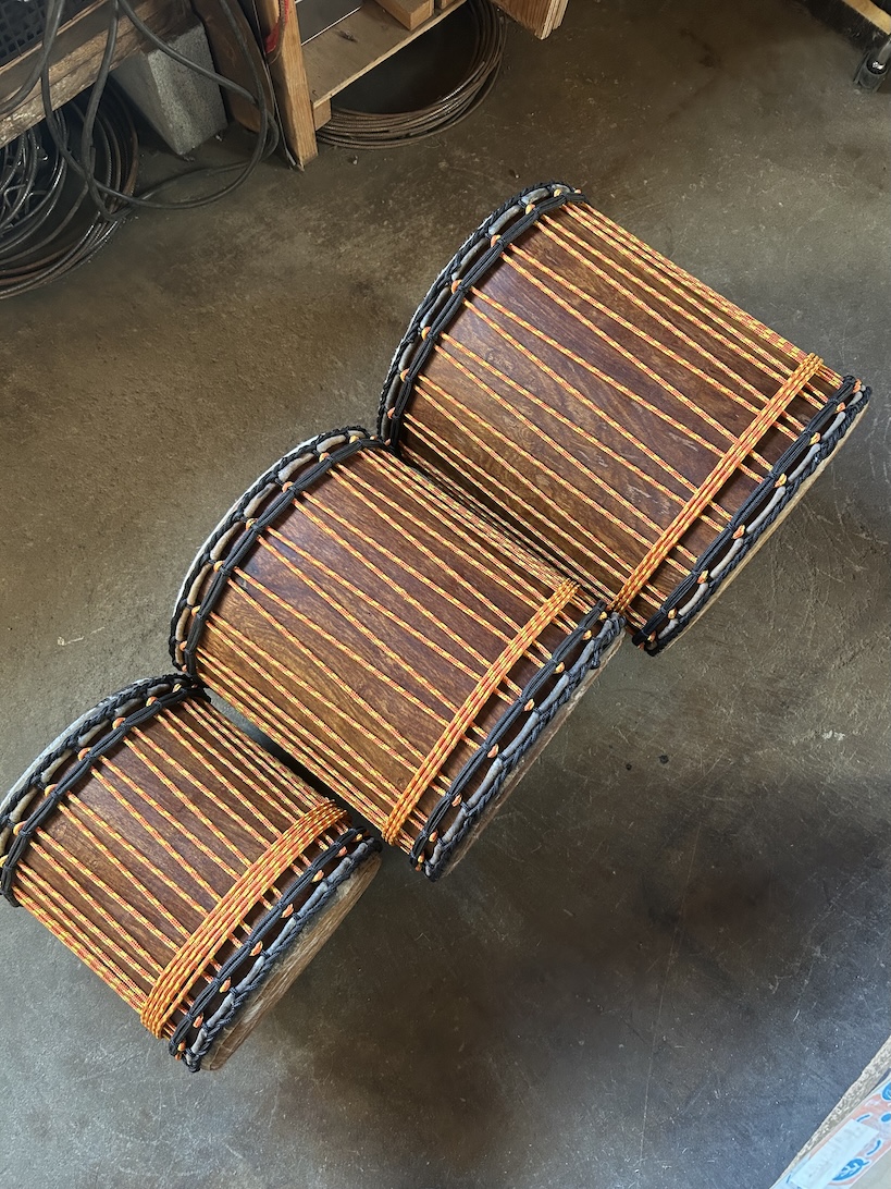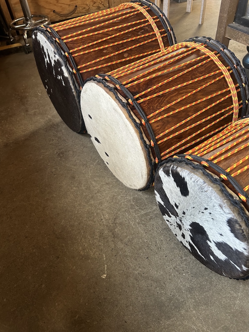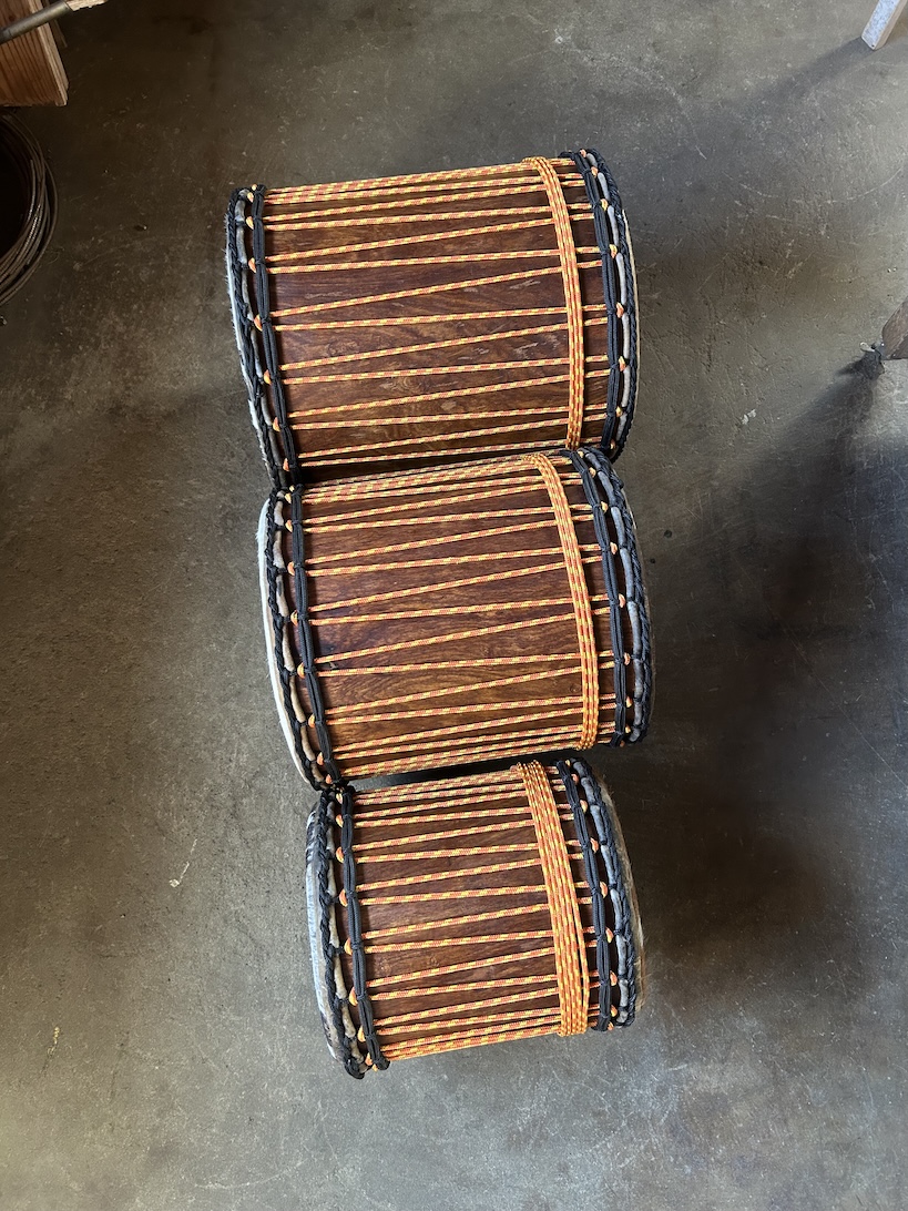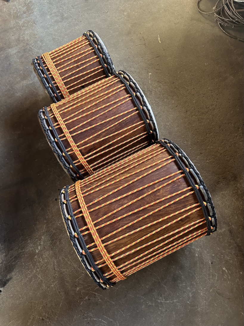 Balafon Woodのコンパクトなサイズ感のドゥンドゥンセットはかなり希少価値あり。鉄リングを一切使わないトラディショナルスタイルで張ってある為ボディー鳴りがしっかりしていてその鳴りもバラフォンウッド特有の煌びやかな倍音が魅力です。